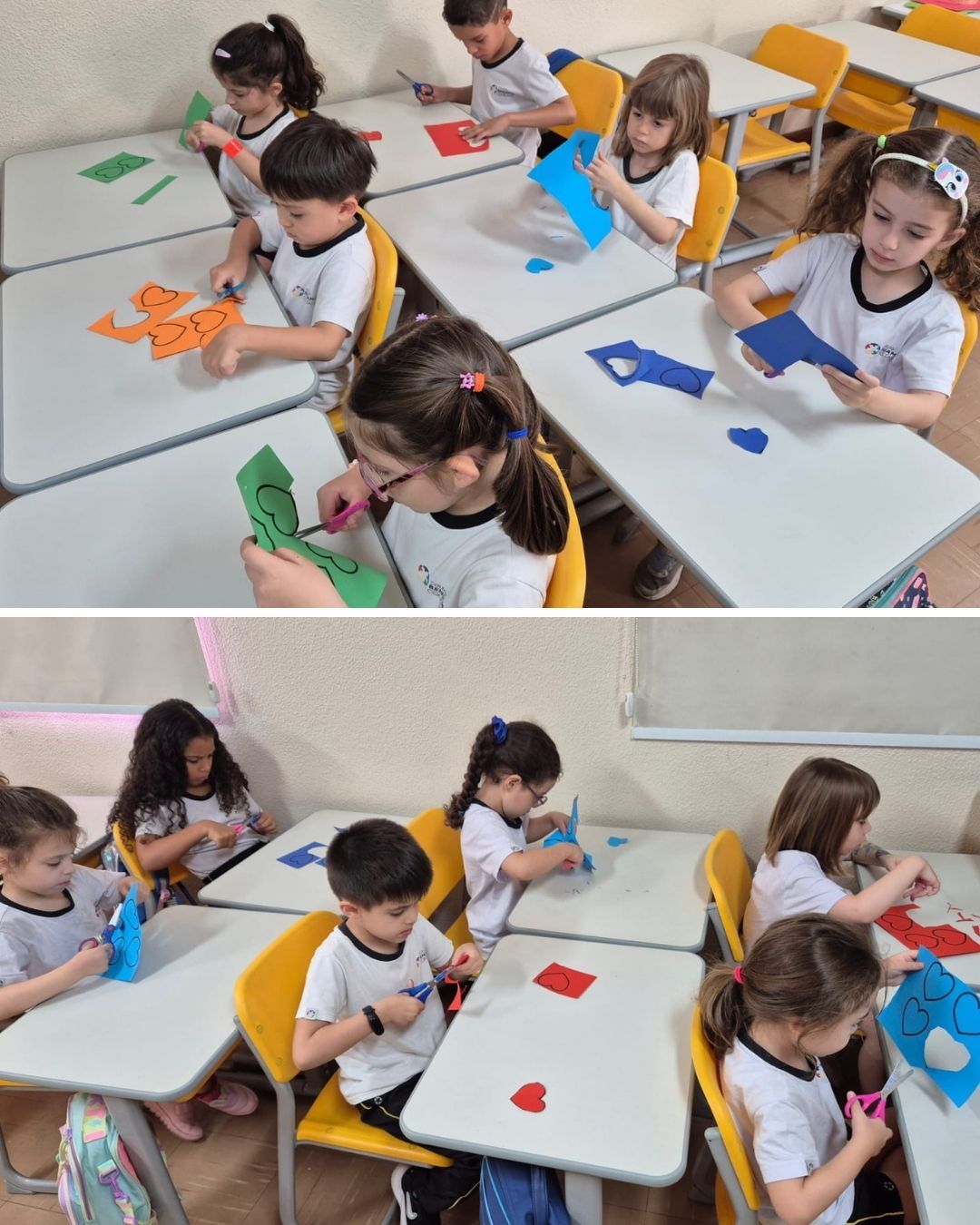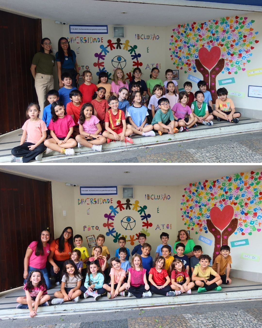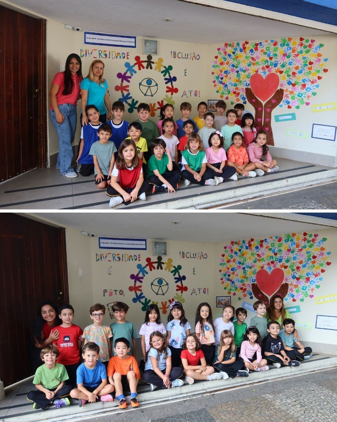 As fotos retratam o painel coletivo desenvolvido pelos alunos da Educação Infantil, 1ºs e 2ºs anos em homenagem à data. A proposta buscou sensibilizar as crianças, de forma lúdica e significativa, sobre a importância do respeito às diferenças, da empatia e da valorização de cada indivíduo.