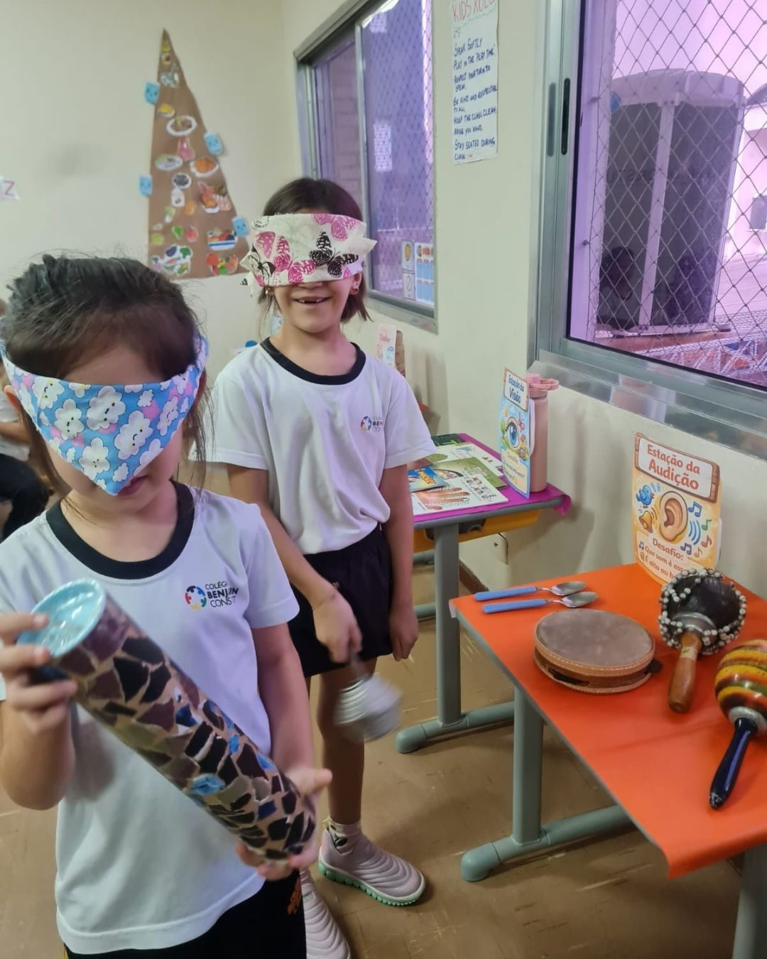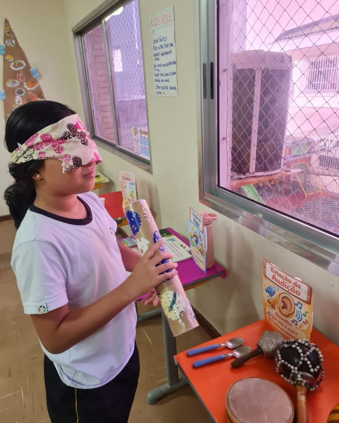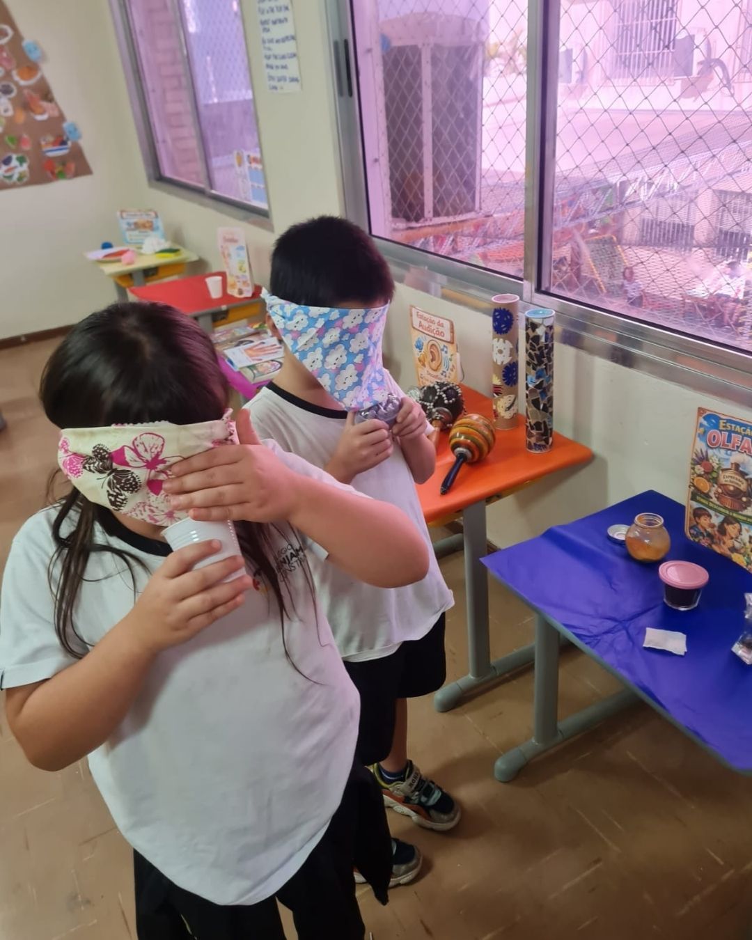 Como um dos temas das aulas de Ciências, trabalhamos os cinco sentidos: audição, tato, olfato, gustação e visão. Essa proposta está alinhada à BNCC, especialmente no desenvolvimento de habilidades relacionadas à percepção do corpo e à interação com o ambiente.