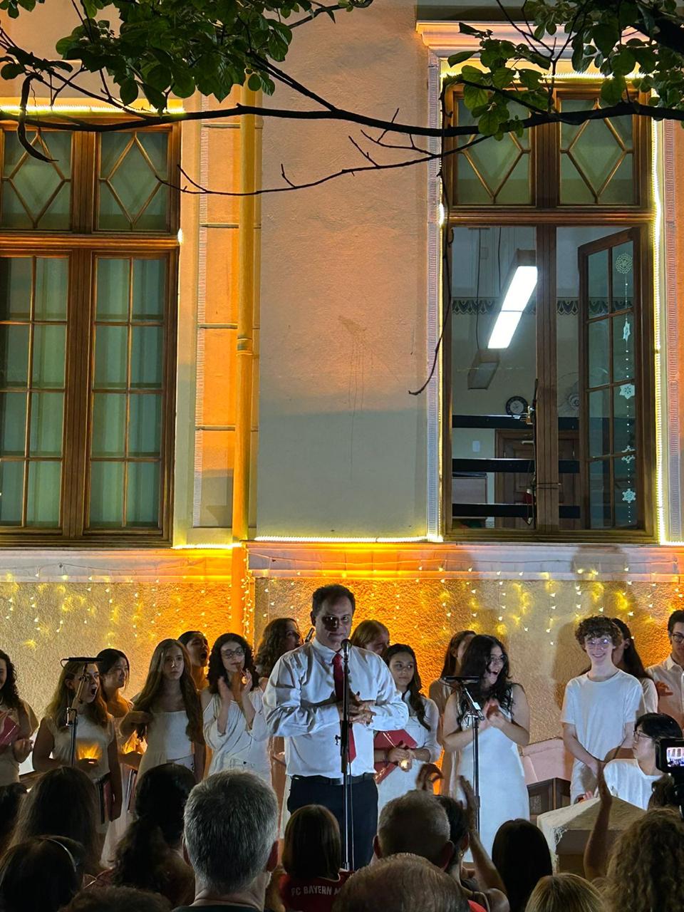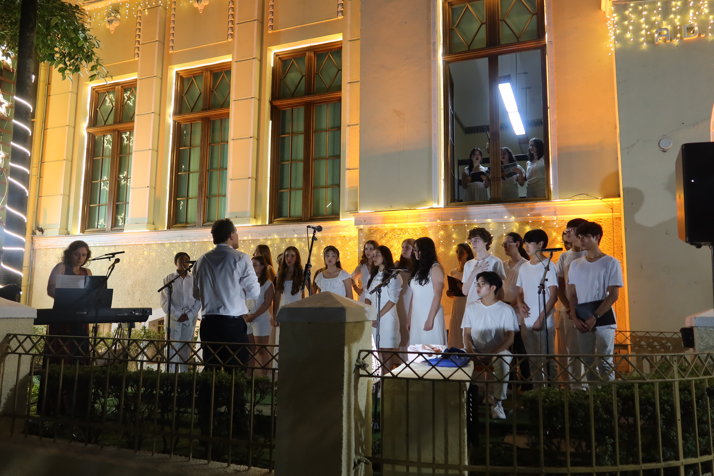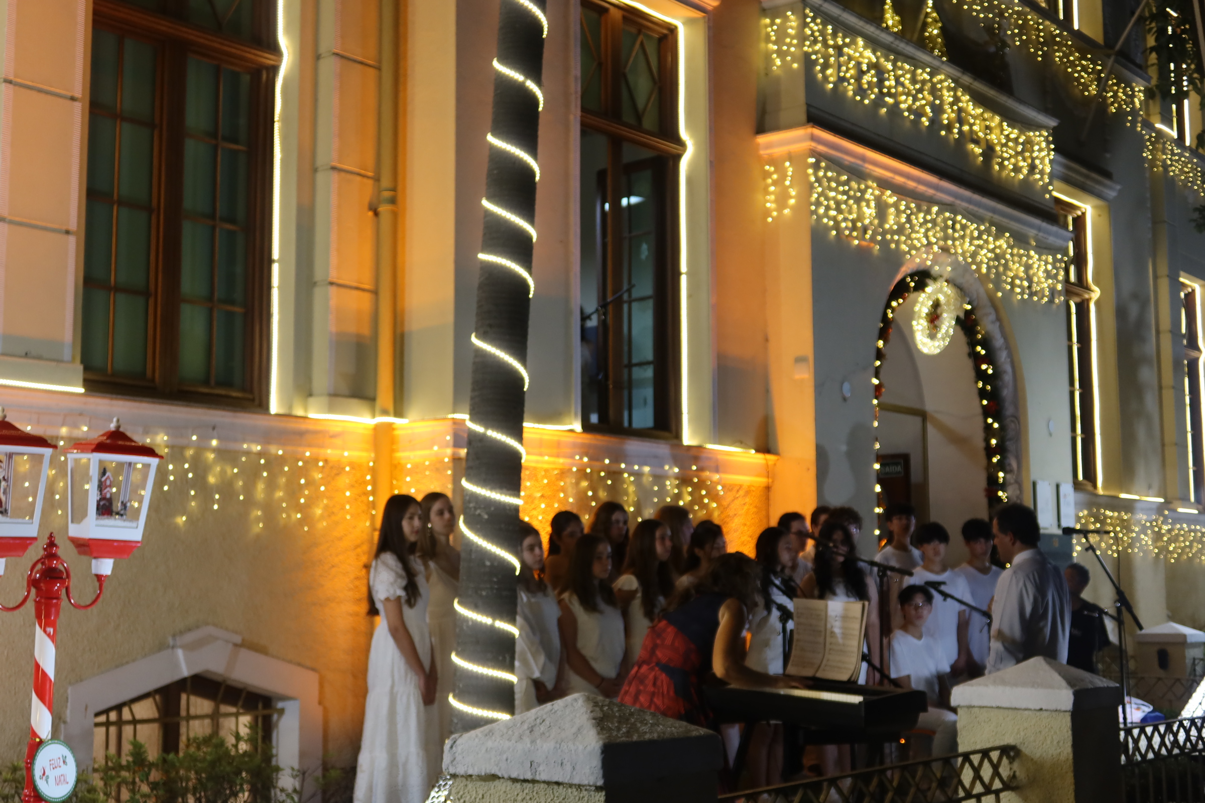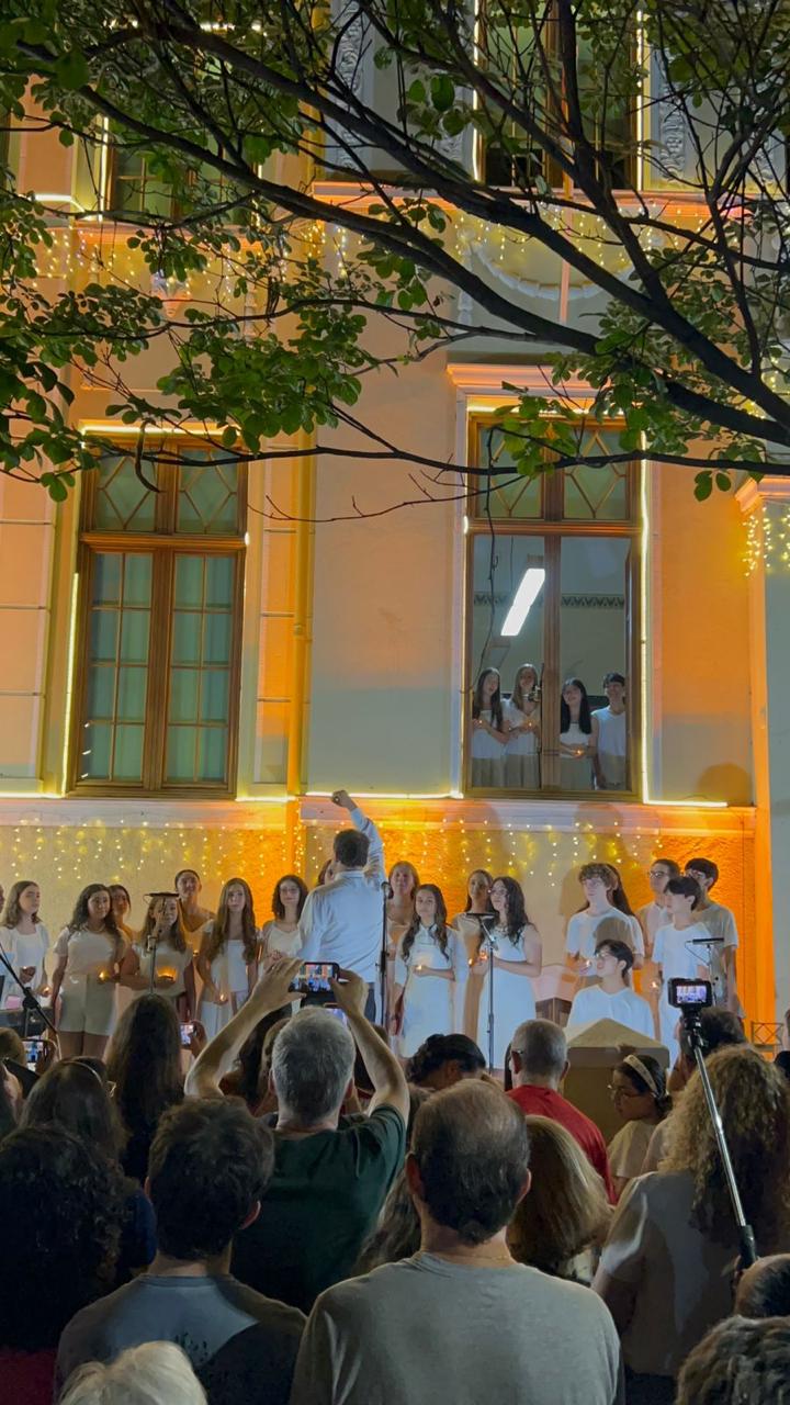 A última apresentação na fachada do colégio foi em 2019, e, este ano, retomamos a tradição. A fachada, iluminada e decorada especialmente para a ocasião, criou o cenário perfeito para a celebração!