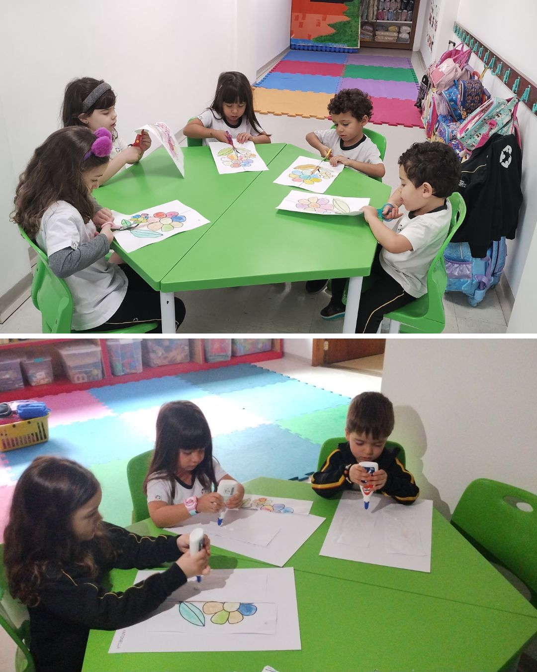 Já no Maternal, as crianças pintaram, recortaram, montaram e colaram uma linda flor, que se transformou em um quebra-cabeça de 2 peças . Uma atividade que uniu diversão, organização e desenvolvimento do pensamento.