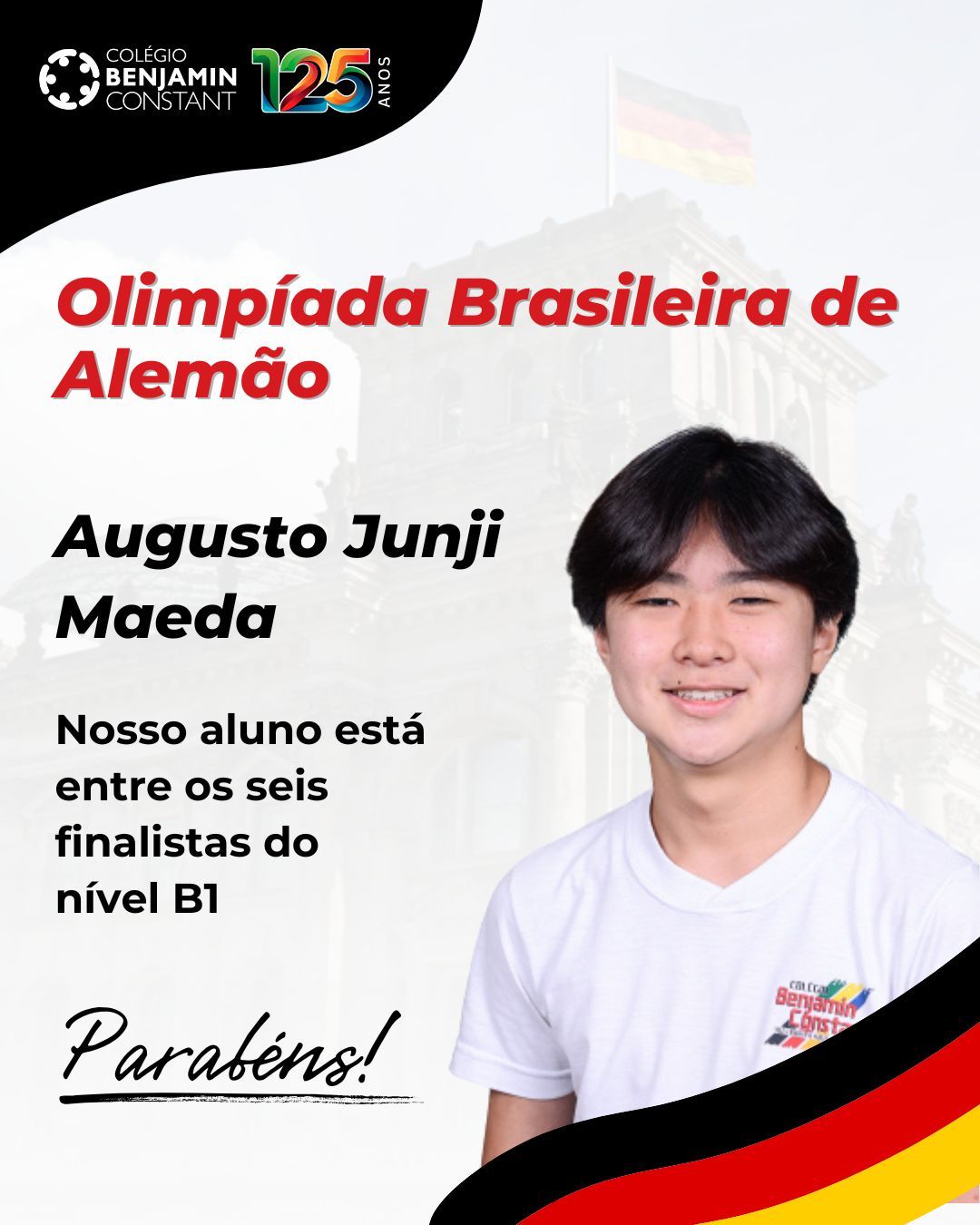 Com grande orgulho, parabenizamos Augusto Junji Maeda pela conquista do 1º lugar no nível B1 na etapa nacional da Olimpíada de Alemão, garantindo sua participação na Olimpíada Internacional de Alemão (IDO) 2026, que acontecerá de 13 a 22 de julho, em Mannheim (Alemanha).