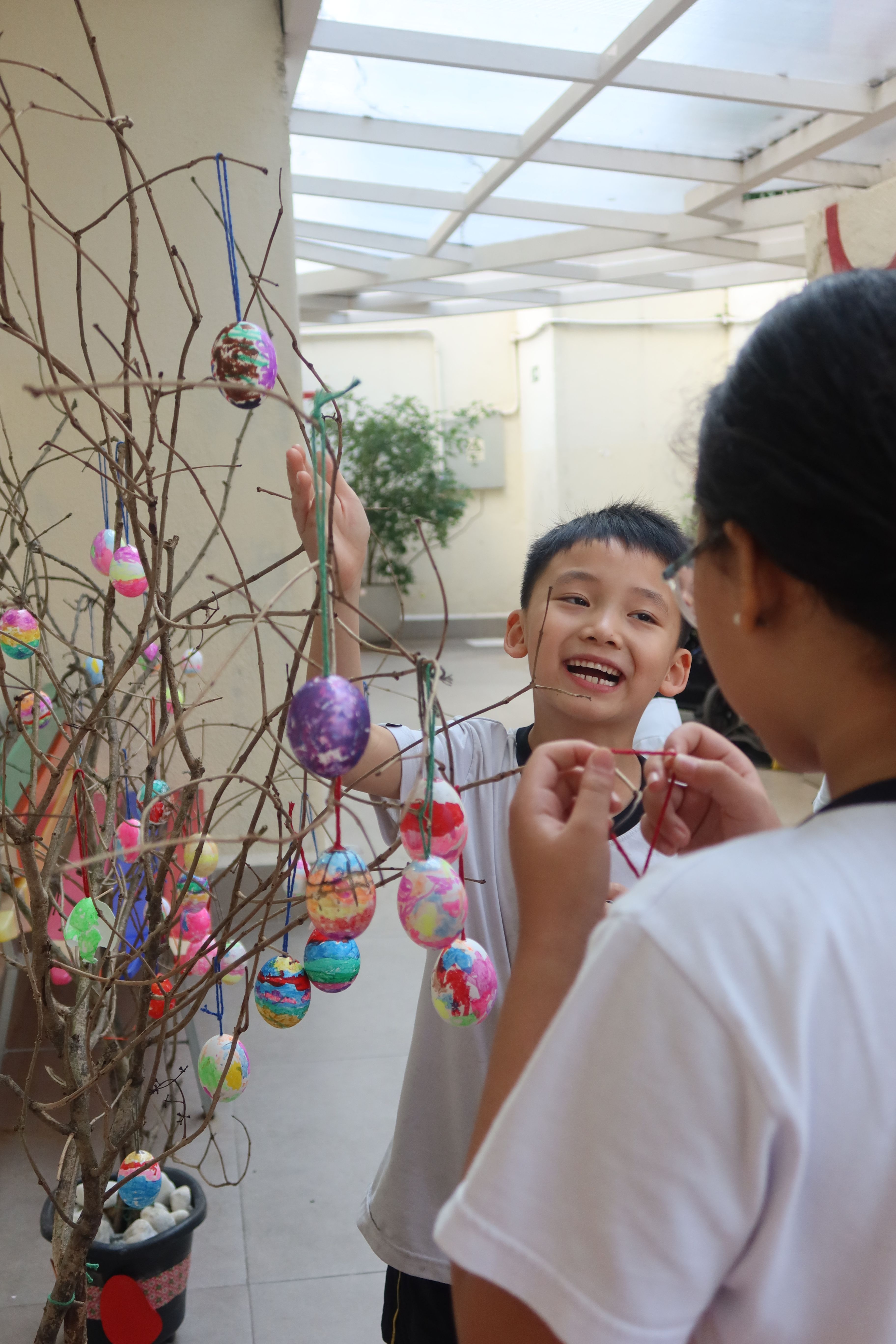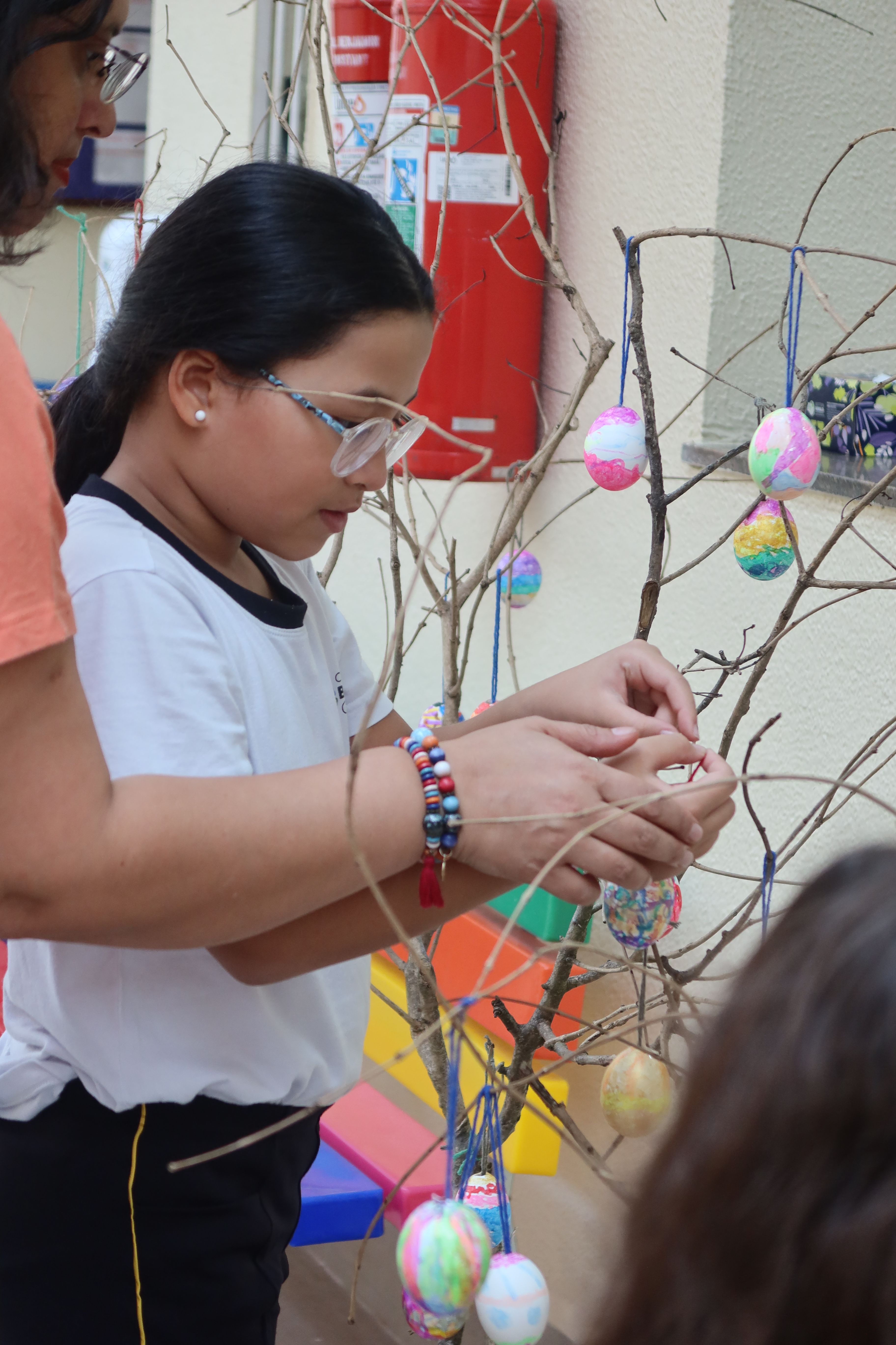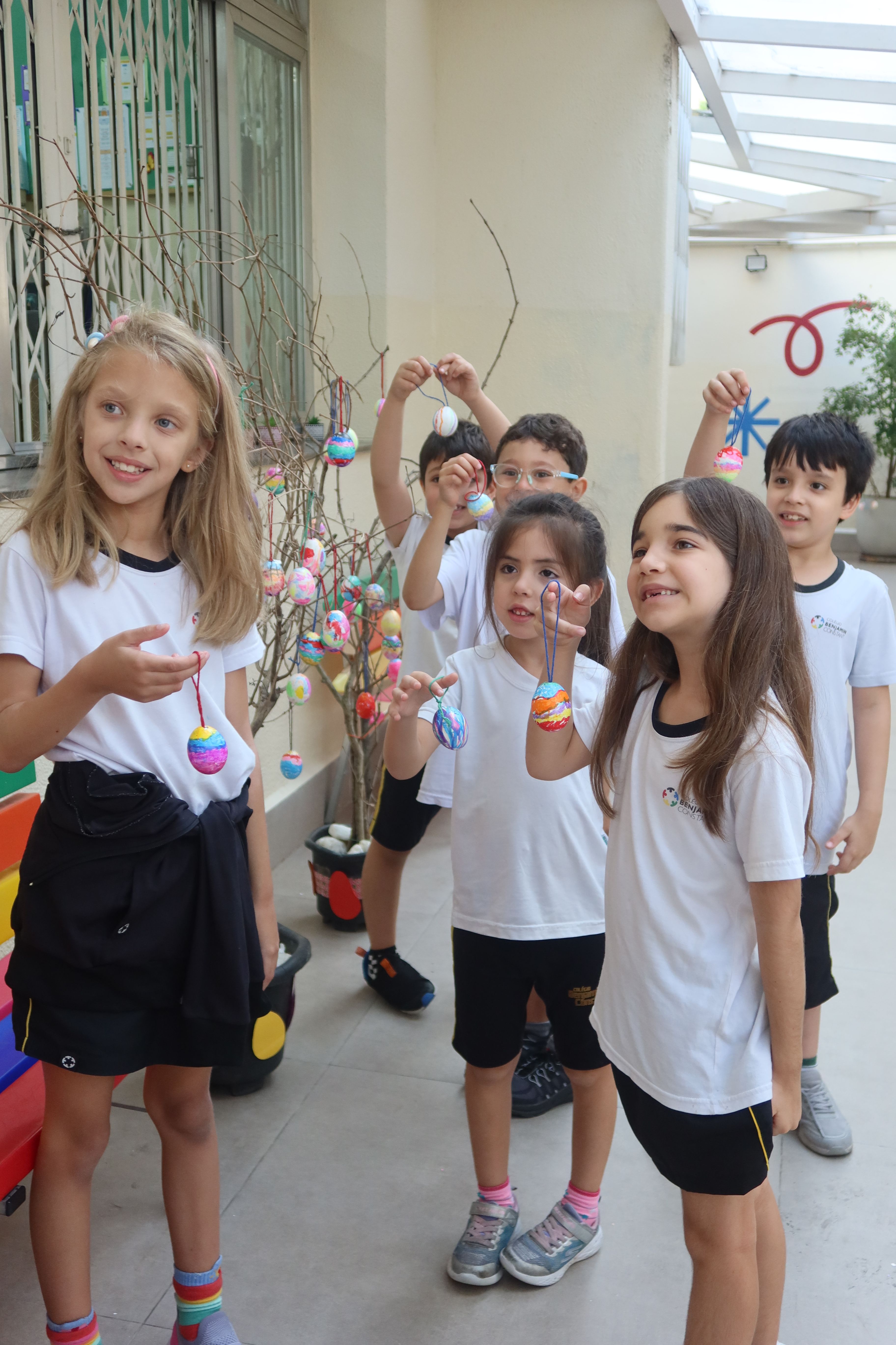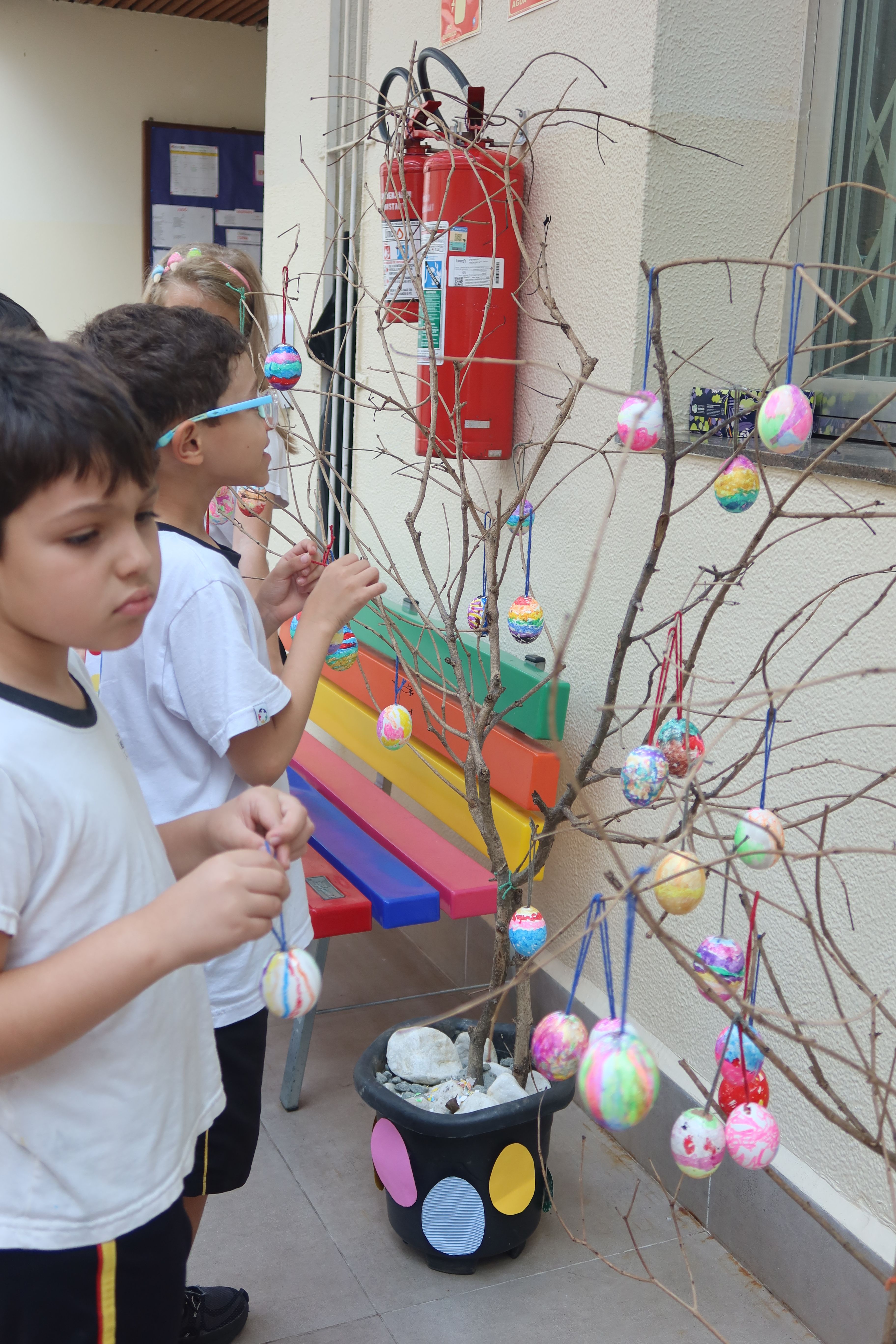 Essa linda tradição é transmitida às crianças no Benja. Nas semanas que antecedem a Páscoa, os alunos dos 1ºs e 2ºs anos pintaram ovos de galinha esvaziados com diversas técnicas artísticas e os penduraram na árvore de Páscoa (Osterbaum).