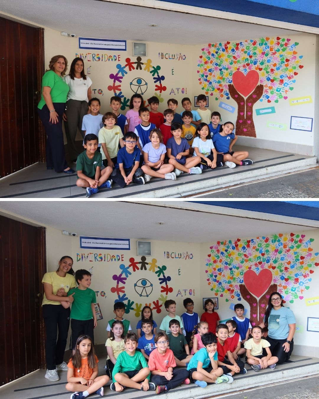 As fotos retratam o painel coletivo desenvolvido pelos alunos da Educação Infantil, 1ºs e 2ºs anos em homenagem à data. A proposta buscou sensibilizar as crianças, de forma lúdica e significativa, sobre a importância do respeito às diferenças, da empatia e da valorização de cada indivíduo.